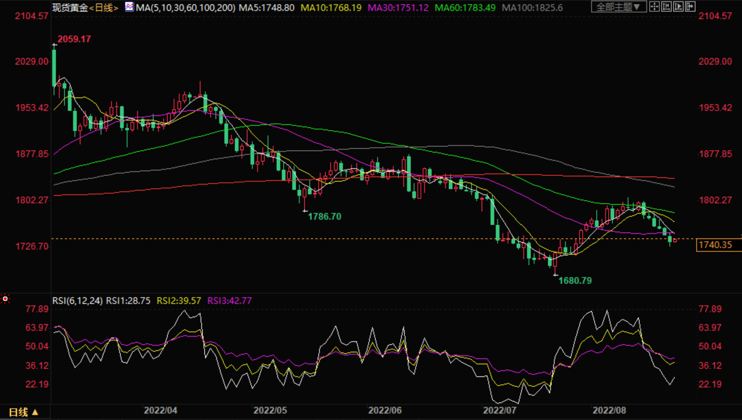 周二(8月23日)亚市盘初,现货黄金在近四周低位附近徘徊,目前交投于1737美元附近,隔夜金价延续跌势,最低触及1727.69美元/盎司,为7月28日以来新低,且为连续六个交易日收跌,投资者愈发担心美国和欧洲加息以遏制通胀的行动会削弱全球经济,美元的避险需求再度飙升,帮助美元创逾五周新高,逼近7月份创下的近二十年高点,对金价打压明显;而且市场预期本周美联储主席鲍威尔将在杰克逊霍尔年会上发表鹰派讲话。