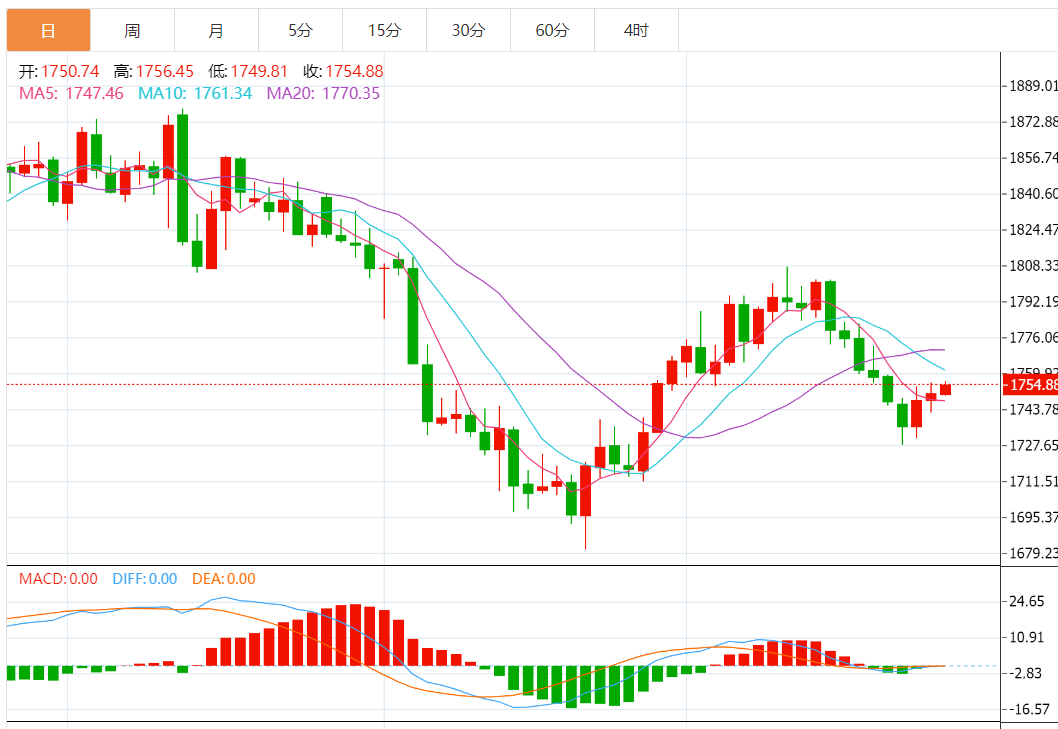 黄金已经连续第三天出现高点和低点均抬高的局面。金价在最近一轮升势的50%斐波那契回撤位1744.05美元/盎司附近受到买盘支撑,但依然低于61.8%斐波那契回撤位1759.20美元/盎司。日线图上的技术指标继续支持金价下行。金价交投在其所有主要移动平均线下方,而技术指标则在负面区域内走低。