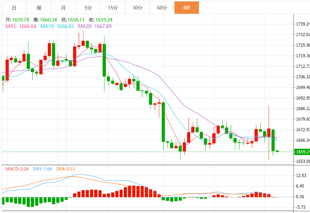 从黄金4小时图来看,金价从50周期简单移动平均线(SMA)明显回落,加之金价跌破本周支撑线,这令黄金空头对金价刷新年内低点(目前约为1654美元/盎司)抱有希望。