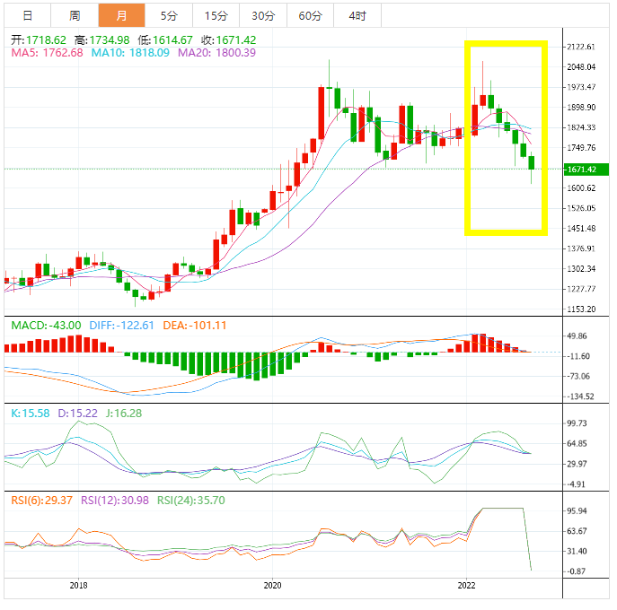 金价最近跌破了两年低点和200週移动均线1,691/76美元,标志著一个巨大的‘双顶’的形成,因此我们将对黄金的中期技术观点改为负面。
