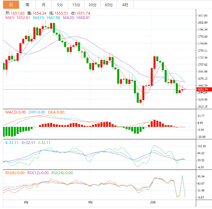 技术上,由于MACD死叉信号还比较弱,KDJ也发出了轻微的超卖信号,若金价能够强势收复21日均线,则削弱短线看空信号;10日均线阻力在1674.55附近,10月11日高点阻力在1683.83附近,若能进一步顶破该阻力,则增加短线看涨信号。
