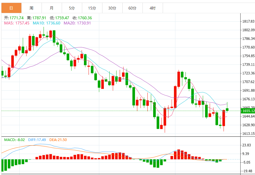 从日线图来看,金价在一个下行通道中交易。这表明市场情绪存在明显的长期看跌倾向。因此,黄金空头的长期获利目标将在1591美元/盎司或者更低的1513美元/盎司;另一方面,多头将把长期获利目标定在1728美元/盎司左右或更高的1801美元/盎司。