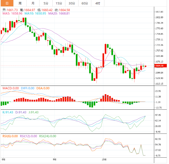 技术面,上周重要支撑位附近的“启明星”底部信号依然有效,短线偏向多头,目前初步顶破布林线中轨,后市有望进一步涨向布林线上轨1718.38附近。下方初步支撑在布林线中轨1664.00附近,5日均线支撑在1658.14附近,失守该位置前,短线偏向多头,10日均线支撑在1649.24附近,若回落至该位置下方,则削弱短线看涨信号。