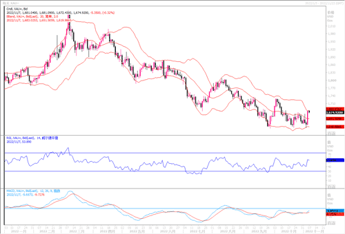 从技术面上来看,黄金经过上周初反复震荡后,于周五在非农数据影响下,出现53美金暴涨,日线报收一根带光脚的巨阳,直接破位布林中轨,且站稳5、10日均线,此形态收线也说明黄金多头积攒了较为爆裂的冲击;4小时图中,黄金触底1616反弹连收8根大阳线,价格强势破位短期均线,并站稳布林带中轨,配合附图指标MACD金叉持续放量,说明多头非常强势,但短线略显有些超卖,恐出现一定幅度的获利调整回落。本周压力先看前期高点1700-1730一线,破位则关注1765-70压力,而回落支撑关注1660-1640一线。