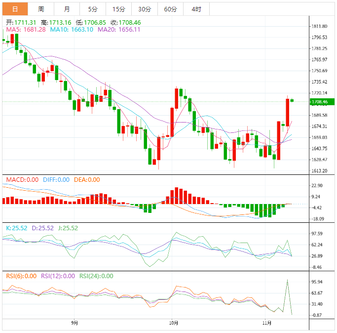 现货黄金窄幅震荡,目前交投于1708美元/盎司附近,守住了隔夜大部分涨势。周二纽约时段,金价顶破1680关口后快速拉升,最高触及1716.79美元/盎司,为10月7日以来新高,也是100日均线阻力所在,一方面,上周美联储利率决议后,市场预计美联储将放缓加息步伐,美元指数持续走弱,美债收益率下跌,给金价提供上涨动能。