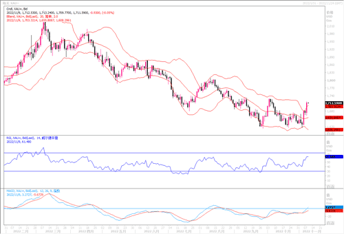 周二由于美债和美元的回落为避险资产带来了提振,黄金也借此机会冲破了1700美元整数关口。投资者继续等待本周晚些时候即将公布的美国通胀数据,可能影响美联储未来加息节奏。美国消费者物价指数报告将在周四(11月10日)公布,根据初步预估,美国12月总体CPI料下降至8.0%,前值8.2%,而核心CPI料下降至6.5%,前值6.6%。美联储利率制定委员会上周将利率上调75个基点,主席鲍威尔表示将继续加息,导致市场调整利率峰值预期。美国激进加息导致美国国债收益率上升,并将美元兑大多数主要货币推高至多年高位,但人们越来越多地猜测这种趋势即将结束。而且即便美联储上周从主席鲍威尔到其他官员都反复强调美国货币政策比美联储政策利率所暗示的更为趋紧,但美元仍未能重返高位,因此让投资者似乎看到美元走高可能已经到了筋疲力尽的地步。此外,交易员还在等待11月8日晚些时候即将开始的美国中期选举。最终结果可能需要几天时间,但市场预测共和党至少会夺回众议院控制权,国会可能陷入僵局。一些分析师表示,该结果可能导致财政刺激减少,对美元不利。