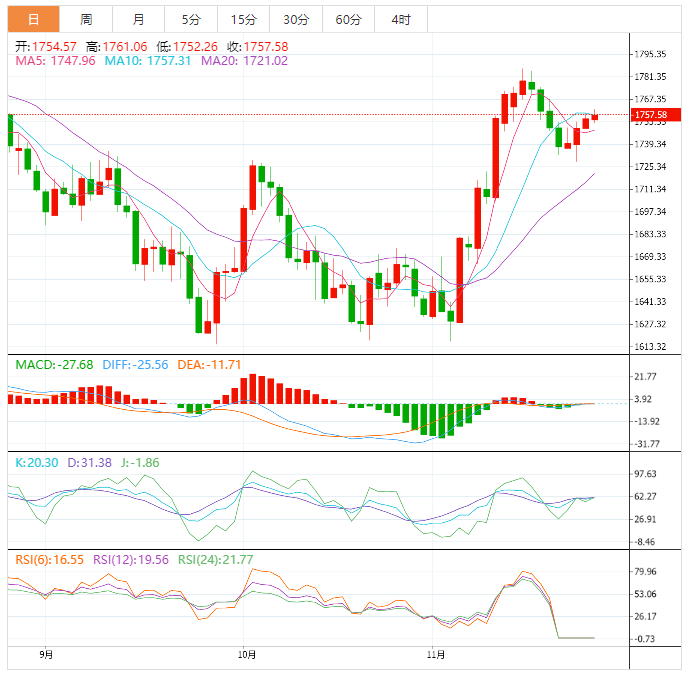 技术上,金价在测试了38.2%的斐波纳奇回档位(从11月3日的低点1,616.69美元到11月15日的高点1,588.88美元)后,在1722.00美元出现了大幅反弹。在测试了20期指数移动平均线(EMA)至1,754.65美元后,金价延续了反弹势头。