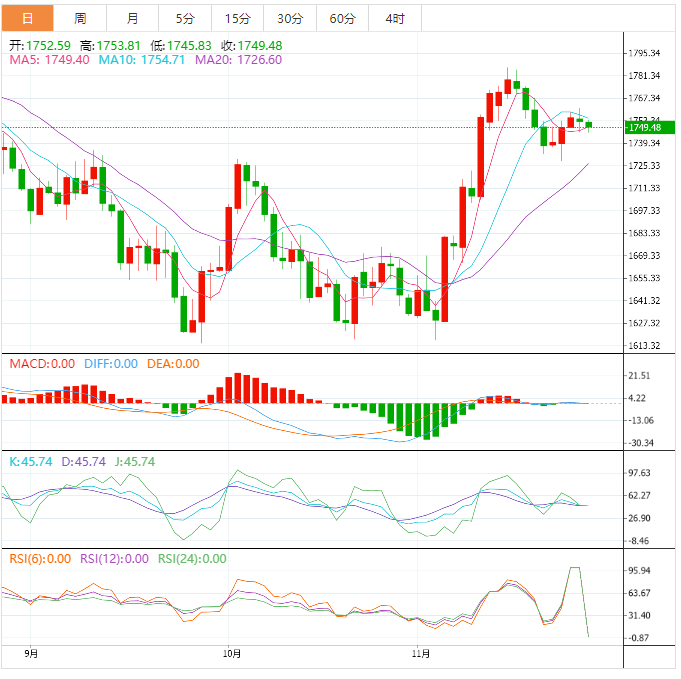 技术上,4小时图下探回升之后一直持续在1740上方震荡,目前也是4小时图布林道中轨的支撑。短线在张口向上震荡上扬,继续关注1740上方支撑。1小时图局部整理蓄势当中,均线指标暂时凌乱发散,短期预计还是先窄幅震荡,或者小幅探高后继续整理,主思路保持低多。