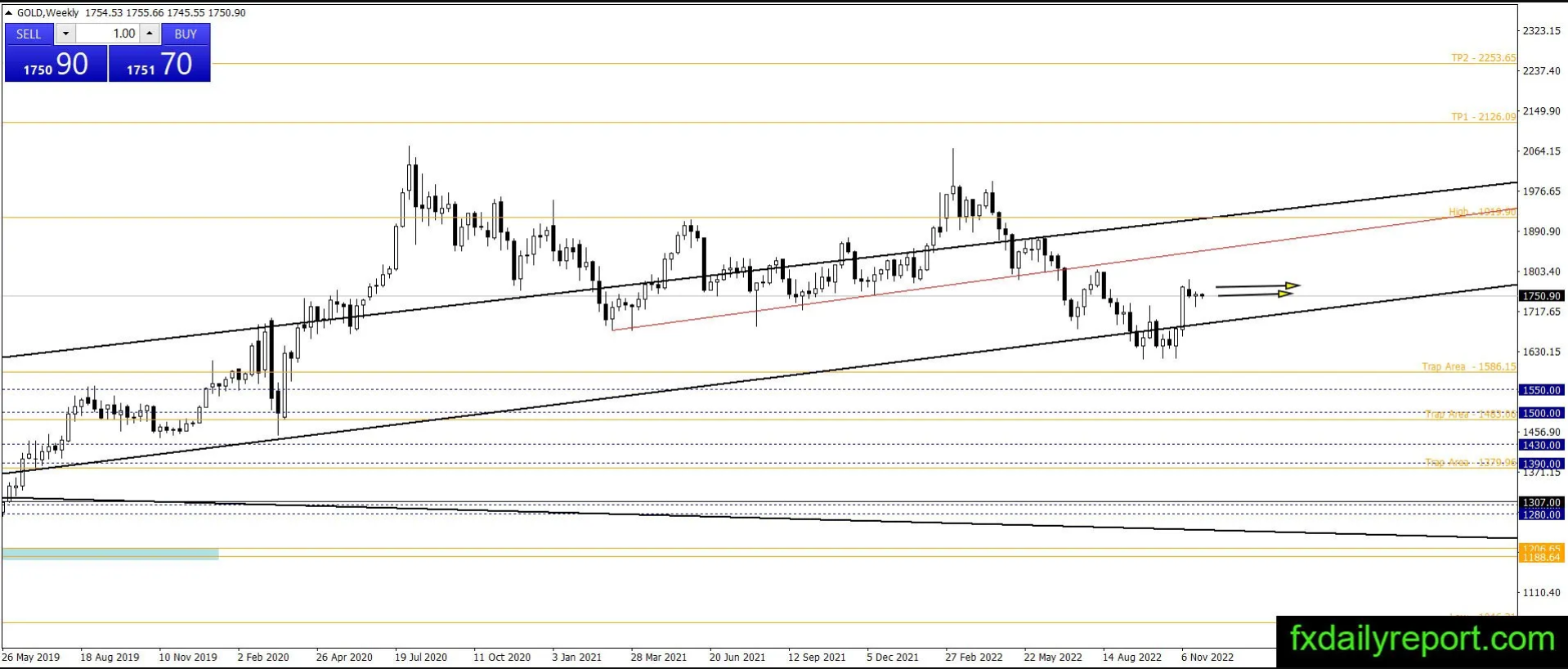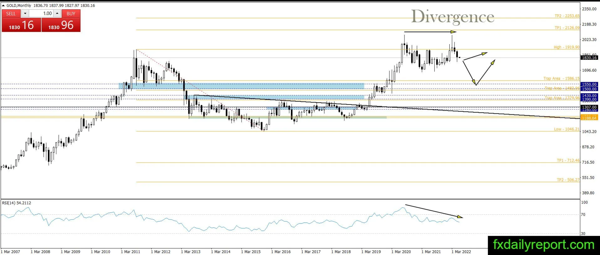 在月度图表上,金价已经跌破双顶模式,进入看跌走势。目前,看涨行情出现了急剧逆转,这可能标志着另一轮看涨行情的开始。如果黄金价格继续下跌,那么1,390 - 1,430美元和1,500 - 1,550美元将成为观察看涨反应的区域。