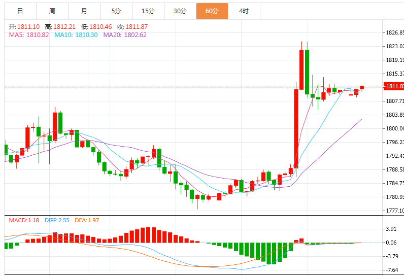 小时图显示,金价已整理至需求范围附近,盘整于1,806-1,810美元窄幅区间内。 20週期指数移动均线在1803.60美元将构成强支撑。