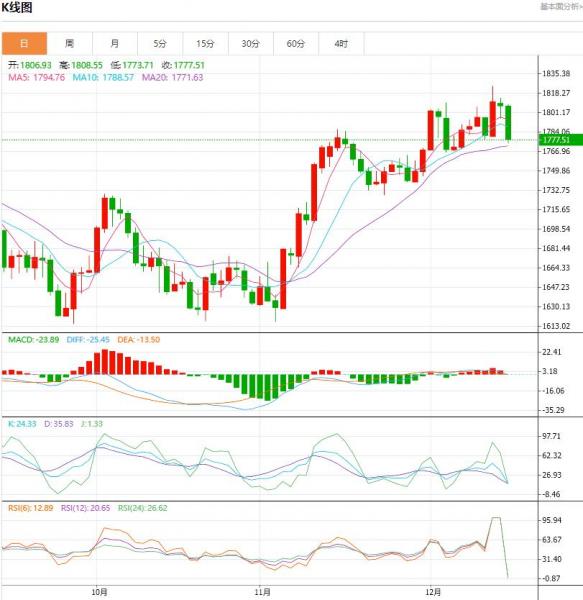 北京时间15:55,现货黄金下跌1.06%至1788.01美元/盎司;COMEX期金主力合约下跌1.12%至1798.3美元/盎司;美元指数上浮0.35%至103.990。美联储周三(12月14日)如期下调加息幅度至50个基点,但主席鲍威尔表示,即使美国经济面临可能的衰退,美联储明年仍将进一步加息。他并表示,如果美联储不能更坚定地控制通胀,将付出更高的代价。