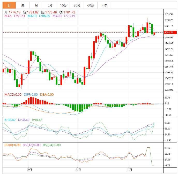 周五盘中,黄金交投于1781.674附近。金价周四一度下跌多达2%,触及约一周以来最低,在美联储表示明年将进一步加息后,美元攀升。现货金下跌1.6%,至每盎司1777.88美元,稍早一度低见1771.89美元。美联储周四一如预期加息50个基点,但在美联储主席鲍威尔称预计利率将在更长时间内保持在较高水平后,黄金下跌多达0.8%。
