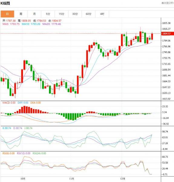 黄金多头现在渴望持续突破1800美元/盎司关口,若如此,金价下一个阻力位料在12月15日高点1809美元/盎司。