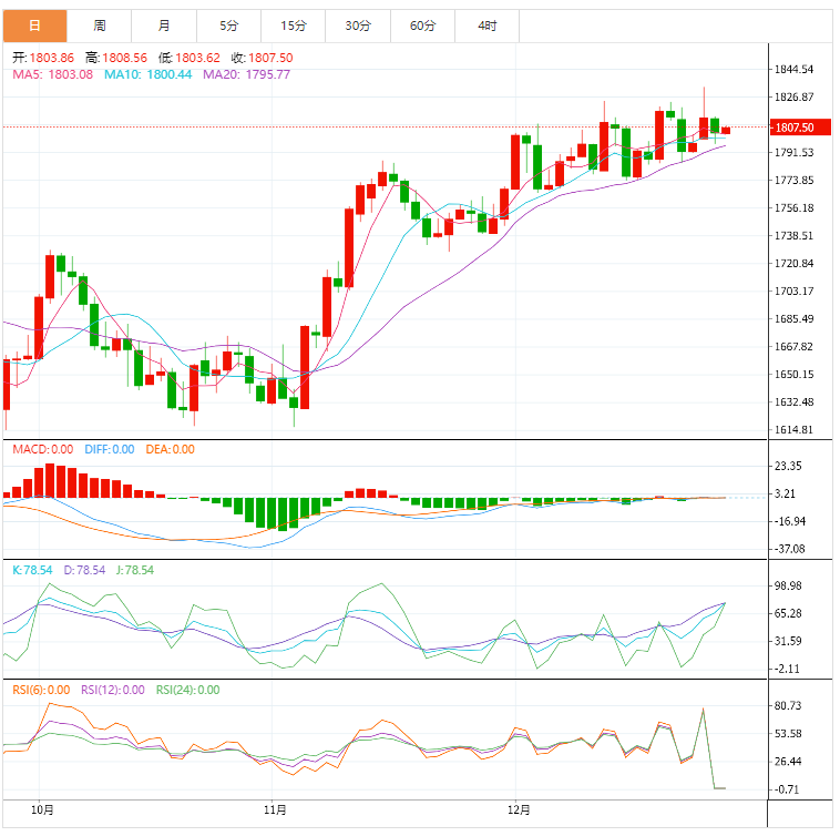 若金价回落跌破1800美元,金价将易于测试上升趋势所处水平1795美元附近。若金价跌破1785美元,可能进一步下跌。下一个支撑位在1773美元下方(12月15日和16日低位)。上行方面,金价在1805美元面临直接阻力。若金价突破1810美元,将改善短期前景。关键水平仍然是1820美元:若金价突破该水平,将为测试1830美元增加一个新的支撑。