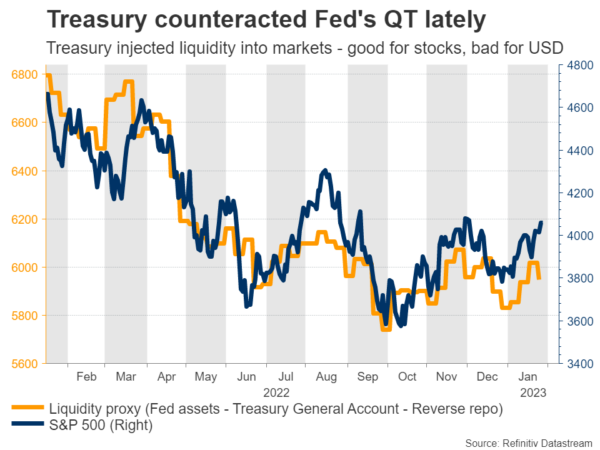 美元面临的另一个问题是,美联储量化紧缩计划的影响最近被美国财政部抵消了。面对另一场债务上限僵局,财政部一直在使用其在美联储的现金缓冲,基本上向市场注入流动性。这种动态使“模因股票”和其他风险资产得以反弹,但对美元不利。