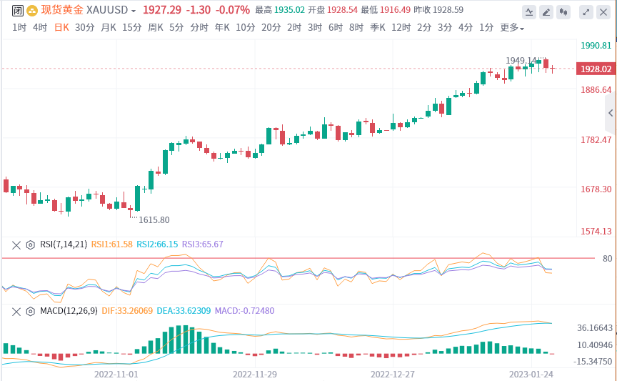 在日线图上,金价自2022年11月23日以来不断攀升,涨势强劲没有明显的回调,从中长期走势形态来看,上行趋势大概率仍为结束。