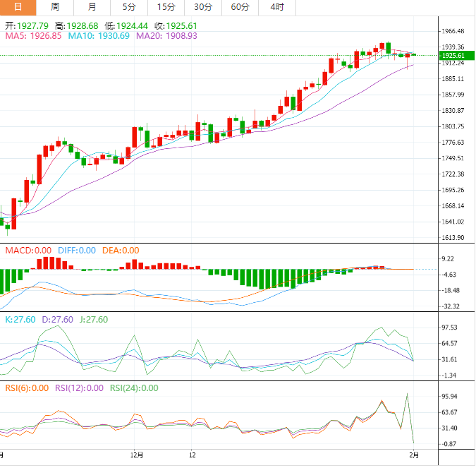 金价在小时图1900.00美元的一轮阻力位附近下跌后,呈现v型复苏。金价已成功突破水平阻力位,该阻力位目前已成为支撑位,位于1月24日低点1,914.19美元上方。
