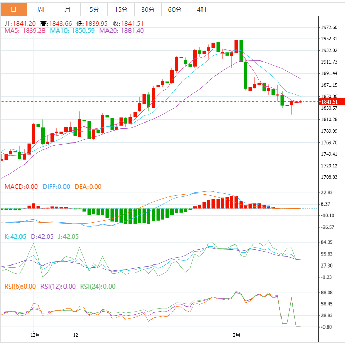 周二亚洲时段,黄金交投于1842.80附近。金价周一收盘几无变动,投资者关注即将公布的美国经济数据,以寻找关于美联储加息路径的线索。现货金收报1841.14美元,上日曾触及12月底以来最低。瑞银分析师Giovanni Staunovo表示,“我们仍预计未来几个季度金价将会上涨,但我认为短期内金价将保持震荡,直到美国经济数据显示经济活动放缓,”投资者关注即将出炉的美联储会议记录以及美国国内生产总值数据。