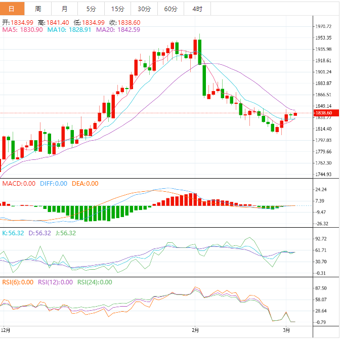 作为金价短期上行障碍的另一个因素是2月09-28日低迷期的50%斐波那契回档位,接近1848美元,突破这一水平可能会推动金价向2月10日和14日的高点靠近1870美元。