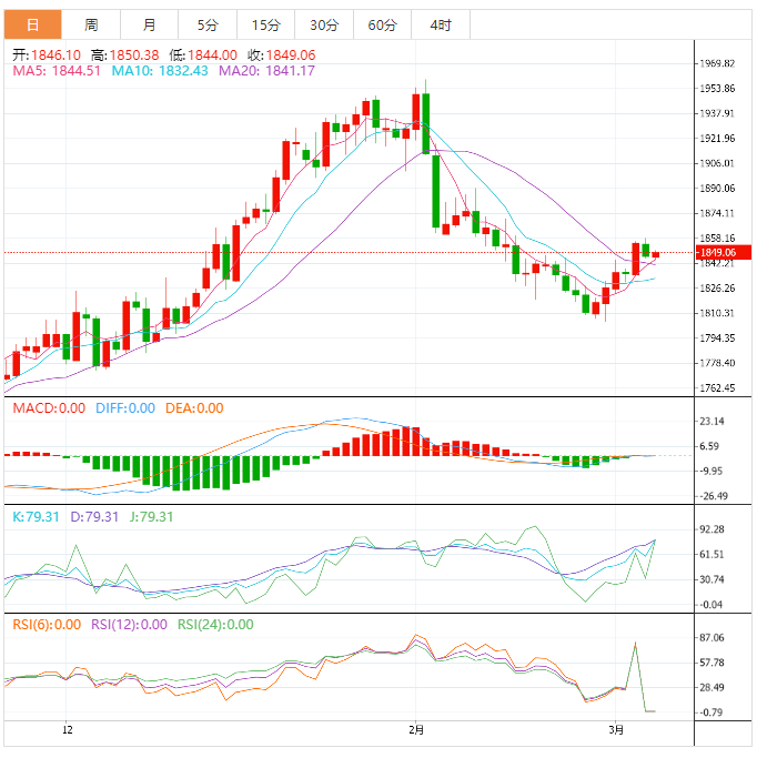虽然欧元区债券收益率和美债收益率上涨,令金价承压,金价也受到55日均线和布林线中轨的压制,但对全球经济衰退的担忧有所回升,给金价提供避险支撑,美联储3月份大概率仅加息25个基点且接近加息周期尾期,这仍吸引逢低买盘支撑金价,失守10日均线1832.32前,金价后市仍有进一步走高机会。