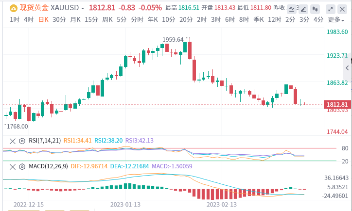 深受美联储主席鲍威尔鹰派讲话的压制,黄金周三(3月8日)仍处低位,报在1813美元附近,盘中曾险些跌穿1800至1805美元的关键支撑水平。