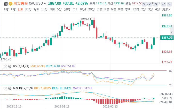 美市尾盘,现货黄金收报1867.15美元/盎司,上升36.34美元或1.98%,盘中最高触及1870.16美元,最低触及1827.69美元。本周,现货黄金累计上升11.16美元或0.60%。