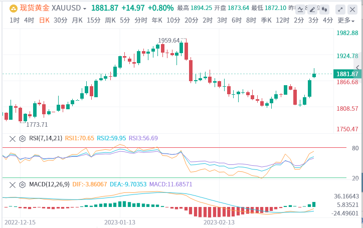 国际现货黄金周五(3月10日)收高,在硅谷银行(SVB)破产后对银行业的担忧,以及美国最新月度非农就业数据公布后美国国债收益率和美元下跌,都为金价提供了支撑。美市尾盘,现货黄金收报1867.15美元/盎司,上升36.34美元或1.98%,盘中最高触及1870.16美元,最低触及1827.69美元。全周,现货黄金累计上升11.16美元或0.60%。