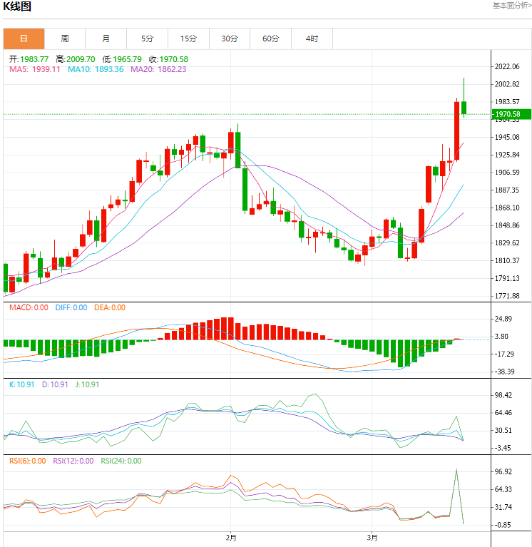 周一(3月20日)欧洲时段盘中,现货金价震荡回落。亚洲时段中,金价曾大幅度飙升,突破2000美元大关,最高触及2009.70美元。此后在欧洲时段在获利了结盘的打压下,金价回落调整。