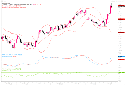 技术上层面上,现货金价在向上突破关键点位之后,目前金价有所回落,多头再次启动还需要反复调整回踩确认过程。接下来20日移动平均线的支撑在1964美元附近,较为稳固。相对强弱指数RSI(14)在60.00-80.00的看涨区间内震荡,这表明上行势头显得较为稳固。