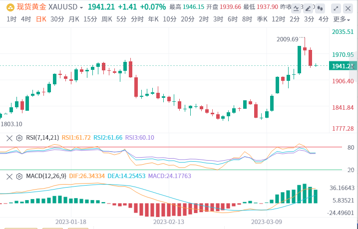周二(3月21日)进入欧市交易时段,在一系列稳定银行业的措施出台后,市场风险情绪趋稳,避险人气有所回落,黄金延续前一日自高位回落的势头,在获利盘打压下当日下跌1.94%,低收盘于1939.80美元/盎司水平。