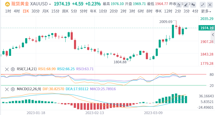 金价周三(3月22日)攀升1.7%,报每盎司1,973.52美元,盘中最高上涨2%至1978.78美元/盎司水平。