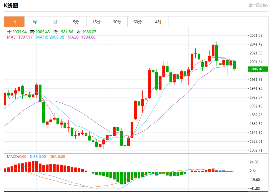 截止发稿,黄金价格现报于1986.90,跌幅0.90%(亚汇网编辑:冰凡)