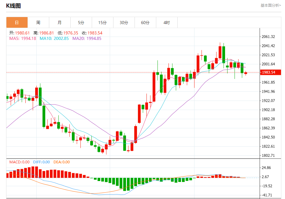 周一盘中,现货黄金报1982.85,涨幅0.02%。