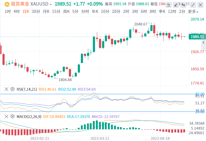 周四(4月27日),美国公布一季度国内生产总值(GDP)数据大幅低于预期,但一季度核心PCE走高,支持美联储5月继续加息。为此,现货黄金下跌逾11美元至1986.44美元/盎司收盘,盘中也一度低落逼近近期的强支撑水位1970美元。