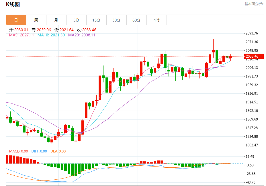 周四盘中,现货黄金报2038.31,涨幅0.41%。