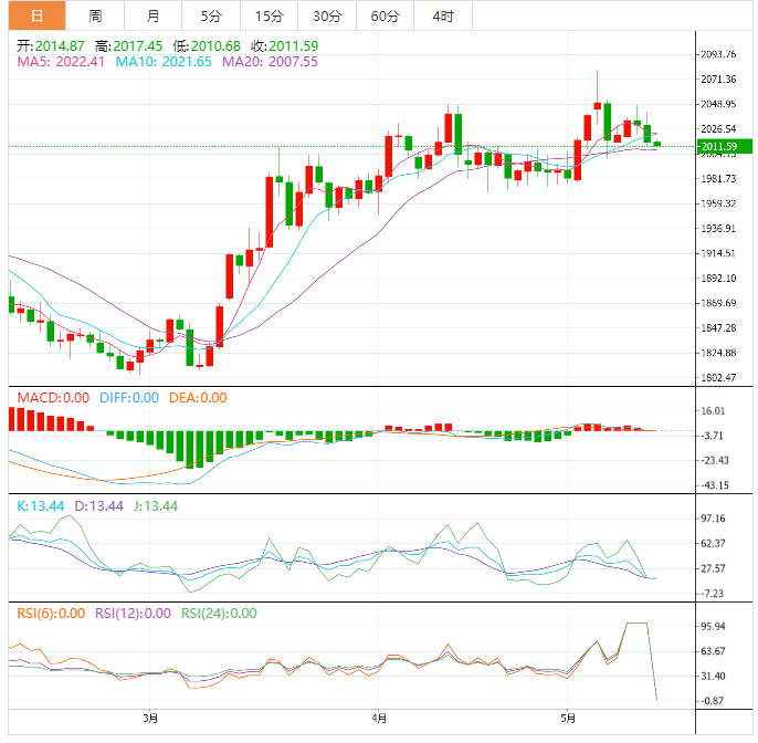 虽然避险情绪也给金价提供支撑,但更多的资金涌入美元,美元指数走强对金价压制明显,而且美元短线看涨信号有所增强,这令金价短线面临进一步下行压力,虽然市场预计美联储6月份将暂停加息,但基本已经被市场消化,短线可能无法给金价提供进一步上涨动能。技术面来看,MACD和KDJ初步死叉,短线金价下破布林线中轨2007.39附近支撑的可能性有所增加,有望进一步向布林线下轨1967.27附近回调。