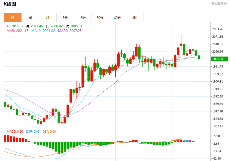 周五盘中,现货黄金报2008.03,跌幅0.34%。