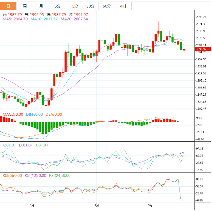 周三亚盘,黄金交投于1991.60附近。黄金周二跌破2000美元,此前美国经济数据和美联储官员的鹰派言论推动了对降息可能推迟的押注,同时交易员们密切关注美国债务上限谈判。美国4月零售销售增长不及预期,但基本趋势稳固,推动美元上扬,并使10年期公债收益率达到两周高点。