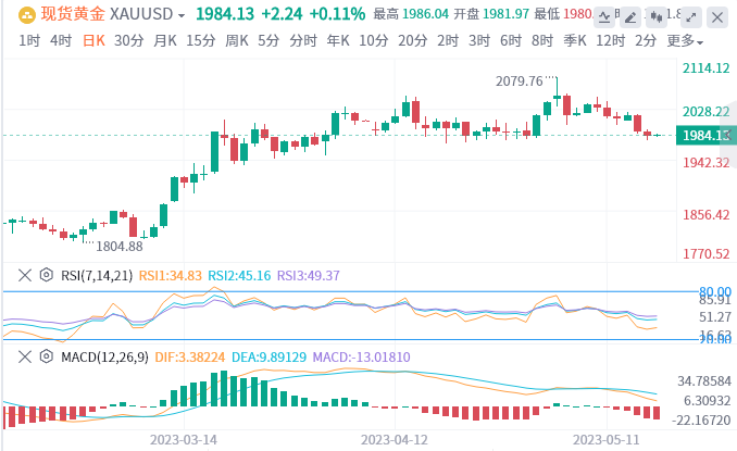 周三(5月17日),美元指数攀升至103.12,这是3月底以来的最强水平。受美元指数的大幅回强的影响,现货黄金继前个交易日大跌后继续小幅下跌,盘中最低触及1974.70美元/盎司水平,最后收盘于1981.36美元,全日下跌0.37%。