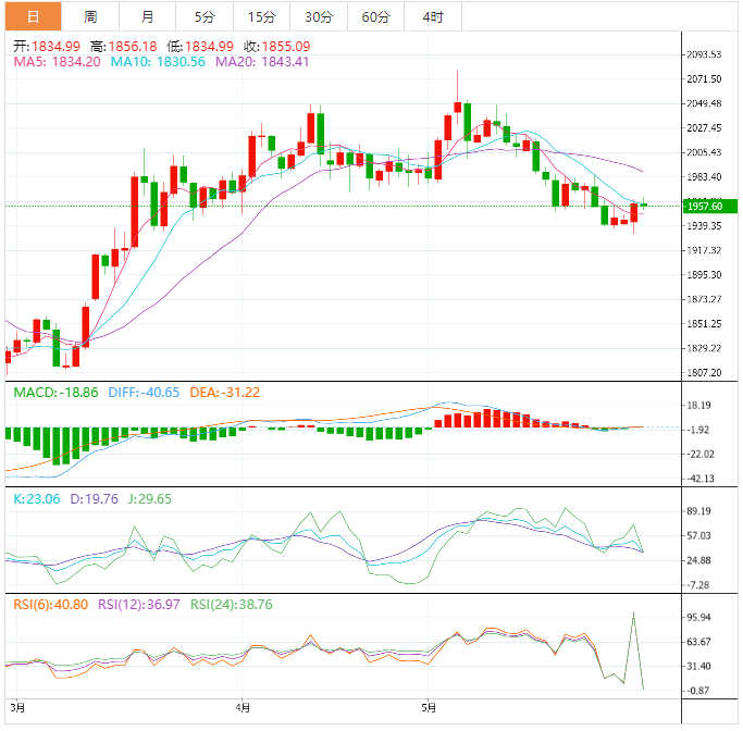 截止5月31日黄金市场,金价从月初开盘价1991.29,到月底截止目前报1957.60。黄金整个5月坐上过山车,金价于5月4日触及最高点2081.82,金价最低点触及5月30日1931.96。