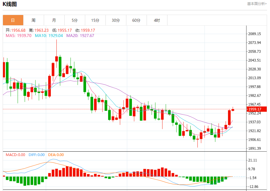 周四盘中,现货黄金报1959.25,涨幅0.10%。