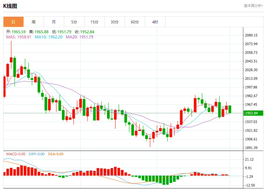 周二盘中,现货黄金报1950.68,跌幅0.75%。