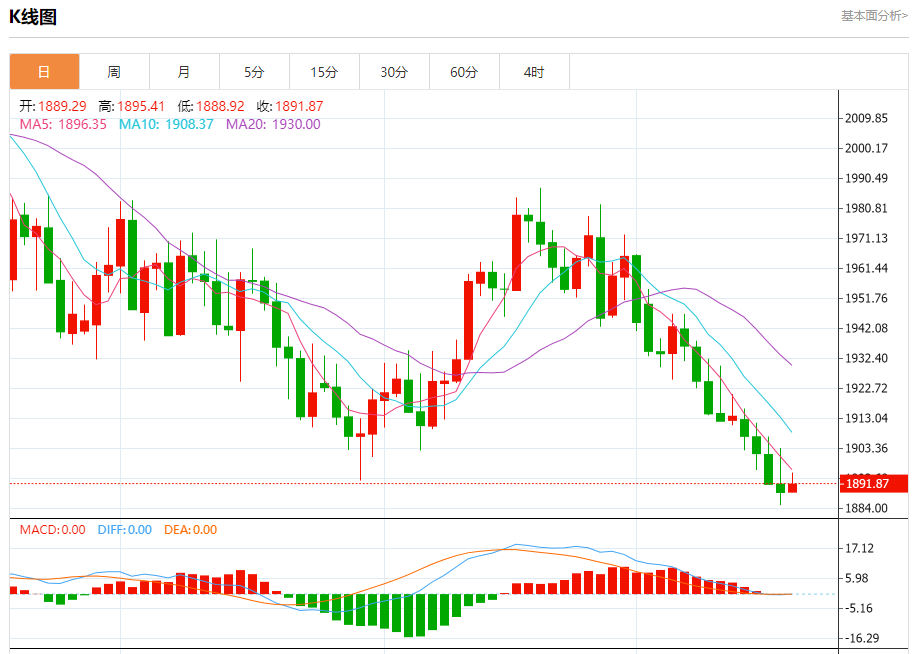 周五盘中,现货黄金报1890.97,涨幅0.09%。