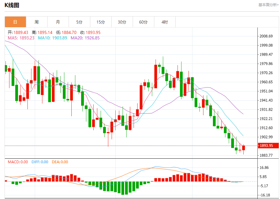 周一盘中,现货黄金报1895.30,涨幅0.30%。