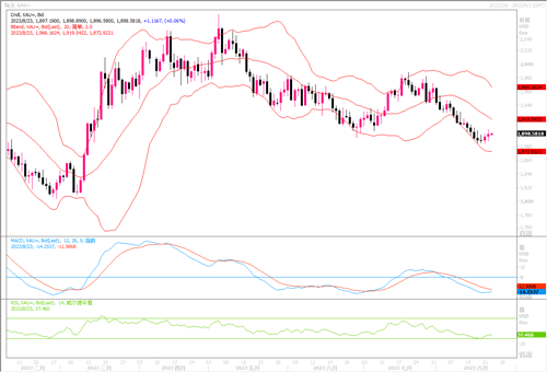 国际黄金周二(8月22日)震荡收涨,开盘价1888.92美元/盎司,最高价1904.50美元/盎司,最低价1889.01美元/盎司,收盘价1897.31美元/盎司,录得涨幅0.14%。