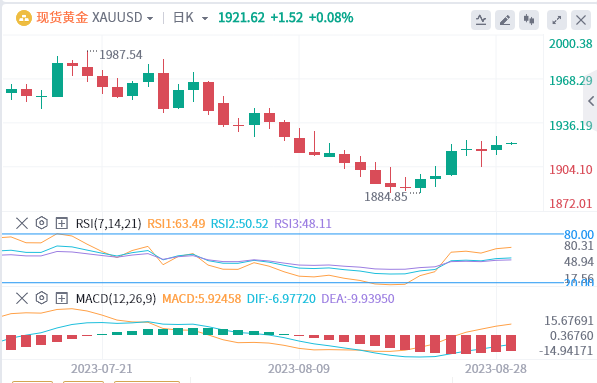 国际黄金周一(8月28日)震荡收涨,开盘价1915.21美元/盎司,最高价1925.88美元/盎司,最低价1912.60美元/盎司,收盘价1924.56美元/盎司。