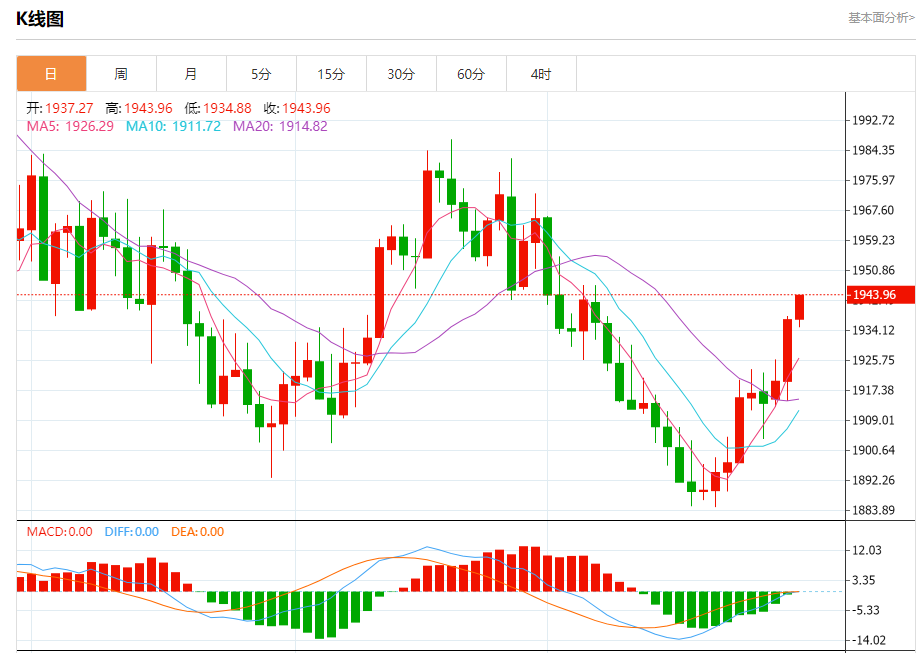 周三盘中,现货黄金报1943.62,涨幅0.33%。