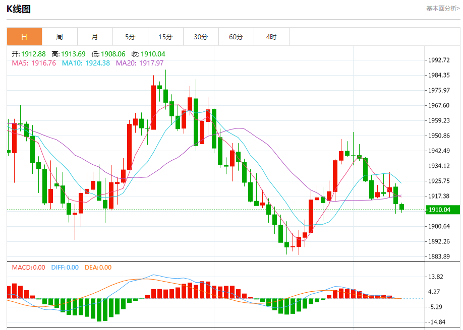 周三盘中,现货黄金报1905.98,跌幅0.38%。