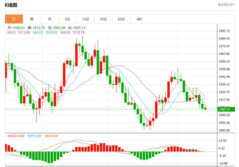 周四盘中,现货黄金报1902.64,跌幅0.28%。