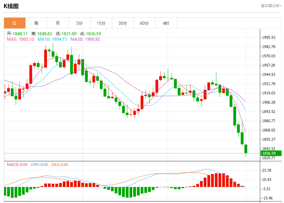 周一盘中,现货黄金报1837.58,跌幅0.62%。